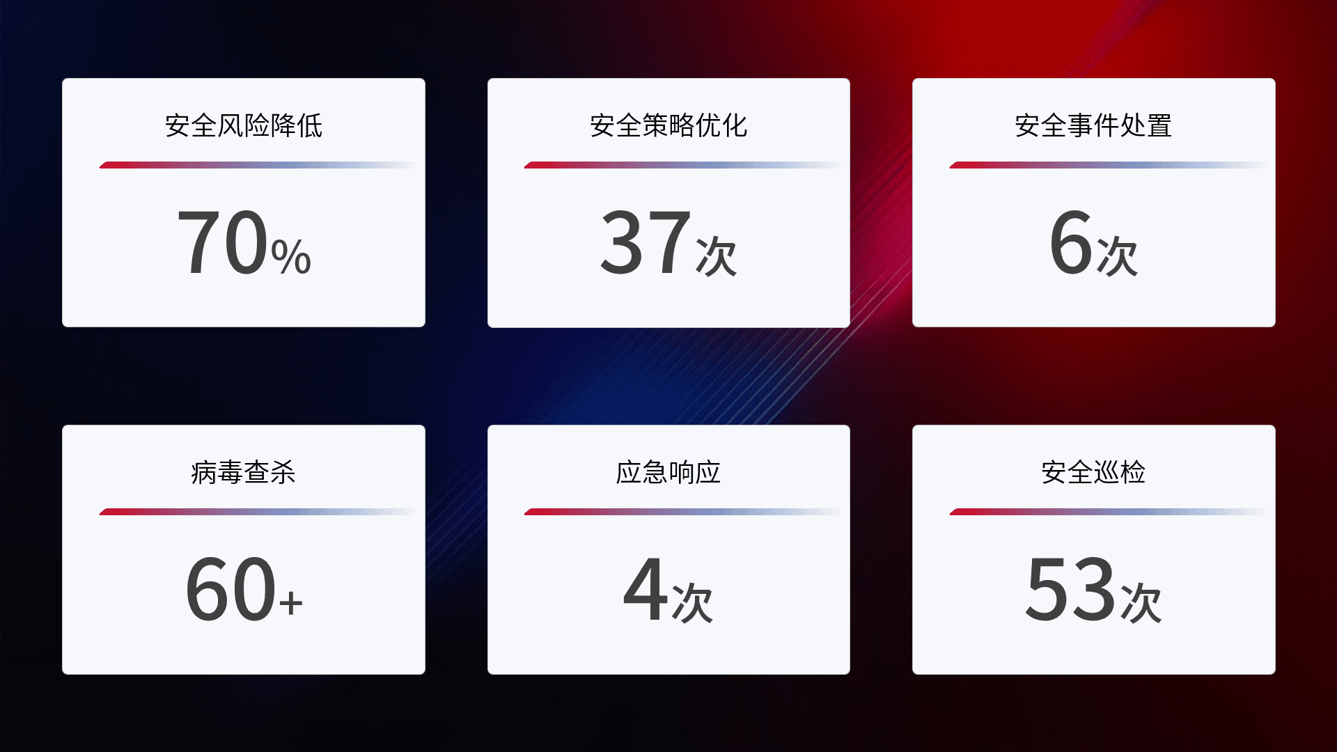 提供全面的安全事件报告体系,,包括处置报告、、周报、、季度和年度总结,,,结合持续监控,,,,帮助客户深入了解网络安全状况。。。